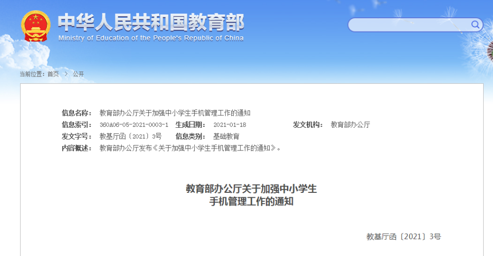 教育部办公厅关于加强中小学生手机管理工作的通知
