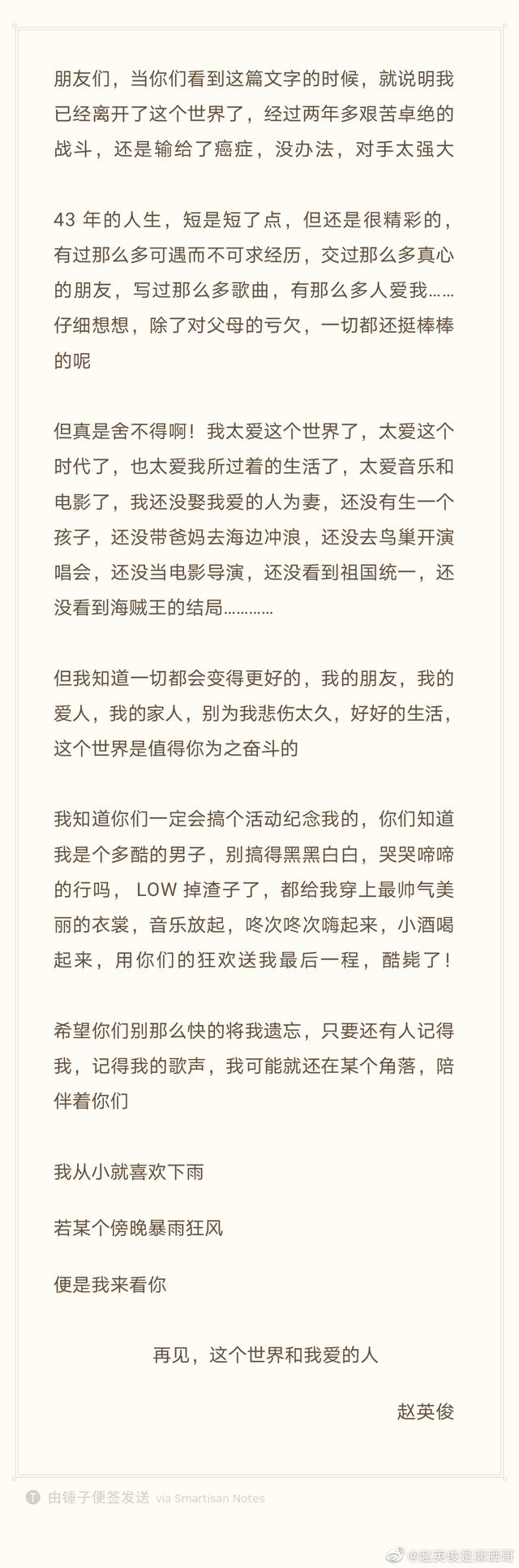赵英俊家人今天下午发讣告,音乐人赵英俊于2021年2月3日14时33分在北京病逝。
