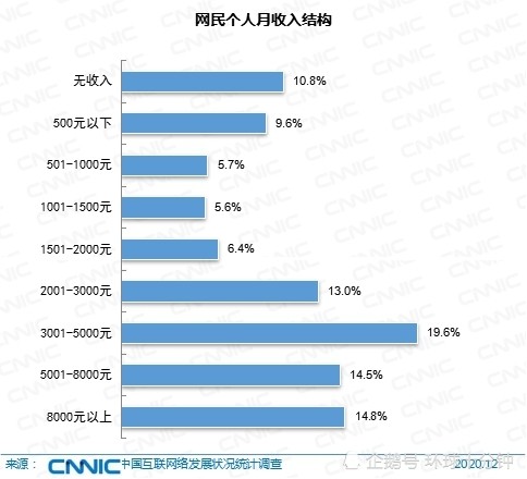 网民收入方面,截至2020年12月,月入2001-5000元的网民比例占32.7%;月收入5000元以上的网民比例为29.3%;有收入但月收入在1000元及以下的网民比例为15.3%。