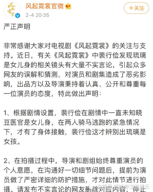 这样的画面,顿时引起了网友的轩然大波,很多网友都认为这样的画面不适宜出现, 许魏洲的手也放在了不适合的地方, 古力娜扎才会面露惊恐。面对网友的质疑,《风起霓裳》剧组和许魏洲工作室都发声明解释称这样的举动是剧情需要,在拍摄过程中已经和演员提前沟通过,并对演员做了严密详细的防护措施,才对此情节进行拍摄。