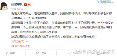 因为不堪网友的质疑,古力娜扎也连发两文回应新剧争议,第一条发文比较刚,古力娜扎称“心里是脏的,看什么都是脏的”。第二条古力娜扎又表示自己在拍摄过程中被保护的很好,导演和服装师都反复确认过,拍摄也很顺利,后续剪辑中发现个别不宜镜头,在播出前也都及时进行了修正处理。一些yxh没必要拿着一个已删除片段的截图进行扩散、带节奏,用一段截图就去编造莫须有的故事,恶意揣测他人,制造不良影响。