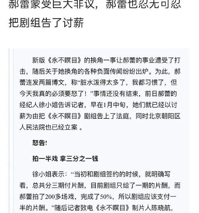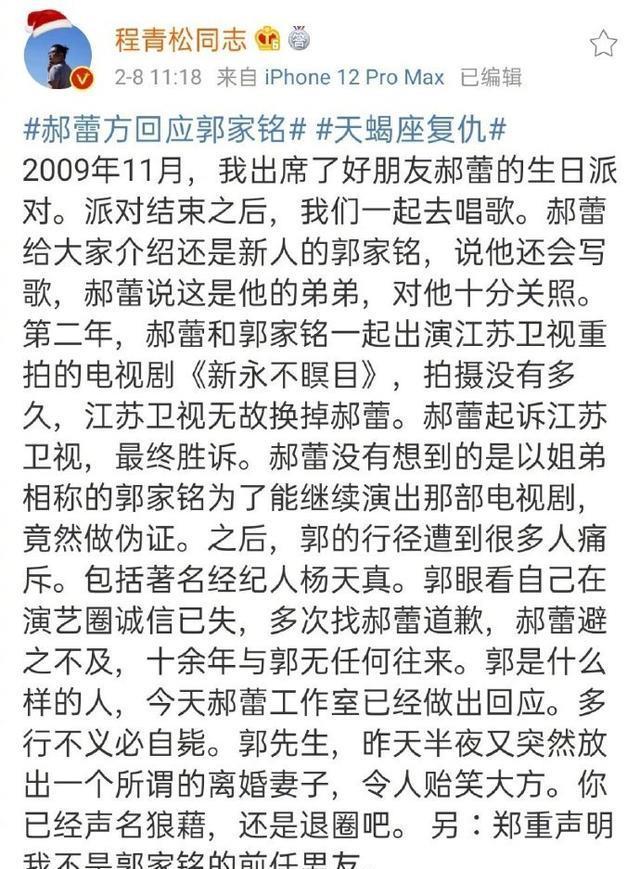 另外导演程青松刚刚发微博也提到了相关细节,透露后来郝蕾因被剧组换掉后的薪酬问题起诉江苏卫视,郭家铭还曾帮剧组做伪证。
