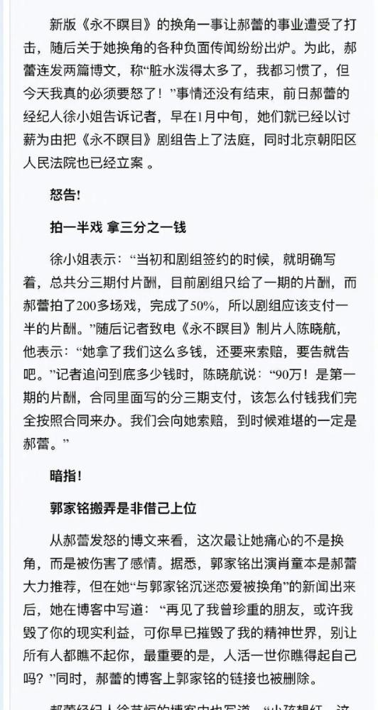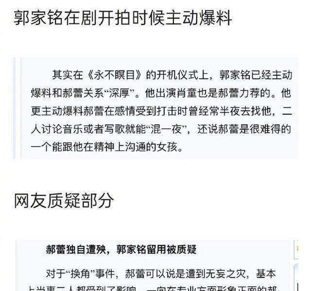 随后就有网友扒出了一系列关键的信息,事情得追溯到2010年的时候,在2010年的时候郭家铭和永不瞑目剧组的换角风波,把郝蕾给换了一事,当时给出的理由是谈恋爱太疯狂耽误拍戏