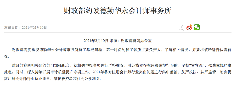 财政部网站2月10日公布称,财政部高度重视德勤华永会计师事务所员工举报问题,第一时间约谈了该所主要负责人,了解相关情况,并要求该所进行认真自查。