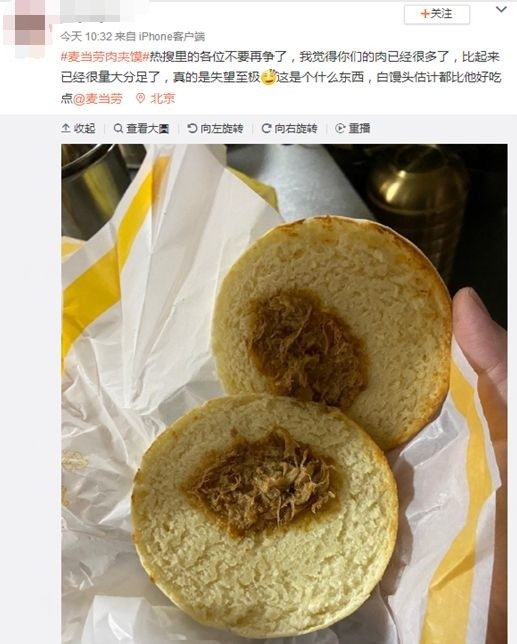 新品上市后,网友在麦当劳购买了一份肉夹馍组合,打开包装发现真实的产品与宣传广告差距甚大,里面的肉非常少。
