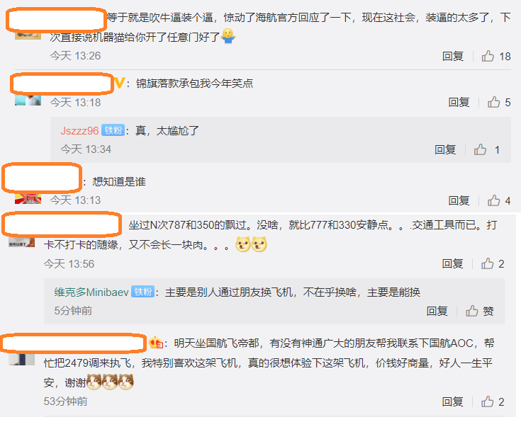 海航的这个回应写的很好,没有正面伤害"旅客"。感谢旅客们对梦之羽飞机的喜爱之情,也对因为这种喜爱而产生的误解表示理解。