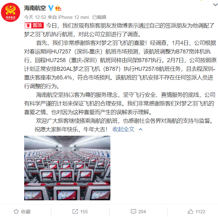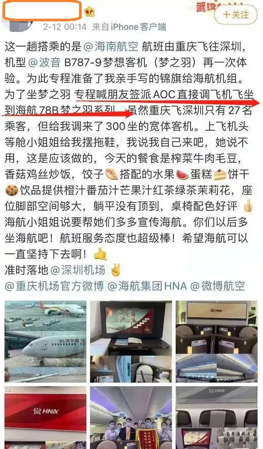 这两天,飞客圈里一个事引起了热议,某重庆"飞友杰出代表","著名航司宣传大使" 发了一张图,称通过朋友签派关系,在自己乘坐的重庆深圳线路上,让海航调配了787梦之羽飞机执飞: