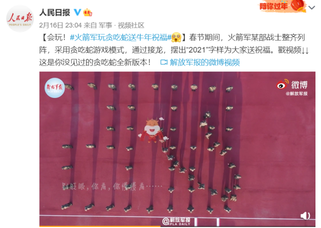 别眨眼,你慢慢看!火箭军玩贪吃蛇送牛年祝福