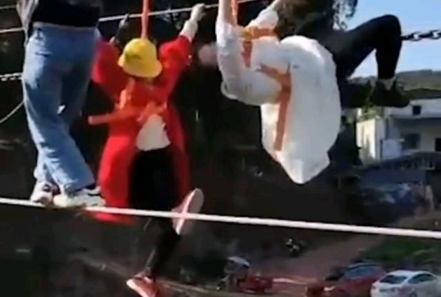 最后这名女子不知是体力不支还是晕厥了,双手脱离钢丝绳,仅凭一根安全带吊着,双手下垂,在半空中来回打转;这名女子最终情况如何,目前不得而知,但是近期多发的景区安全事件,也确实让人该长长记性了。