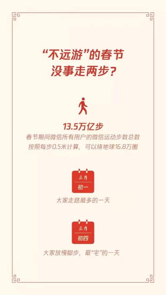 报告还披露了用户的运动数据,春节期间微信所有用户的微信运动步数总数按照每步0.5米计算,可以绕地球16.8万圈。
