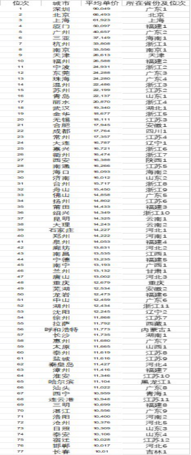 最近有相关媒体对我国各城市房价进行了梳理,发现在全国300多座城市中,有77座城市平均单价超过了10000/㎡,其中深圳高居榜首,平均单价为90049/㎡。如此高的房价,别说一般人,就连知名歌手唐磊都感叹“后悔当年离开深圳去外面打拼做歌手,如今回到深圳也买不起深圳的房子,空有一个深圳户口”、“深圳一套房子动不动就要1000多万,已经不是靠努力工作就可以做到的了”。除深圳外,其他排名前8的城市,如北京、上海、厦门等,平均单价均超过30000元。