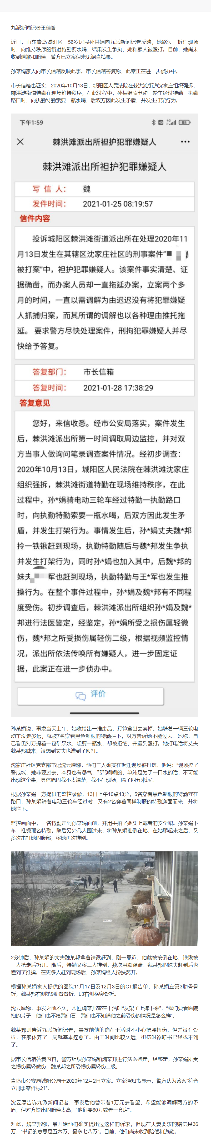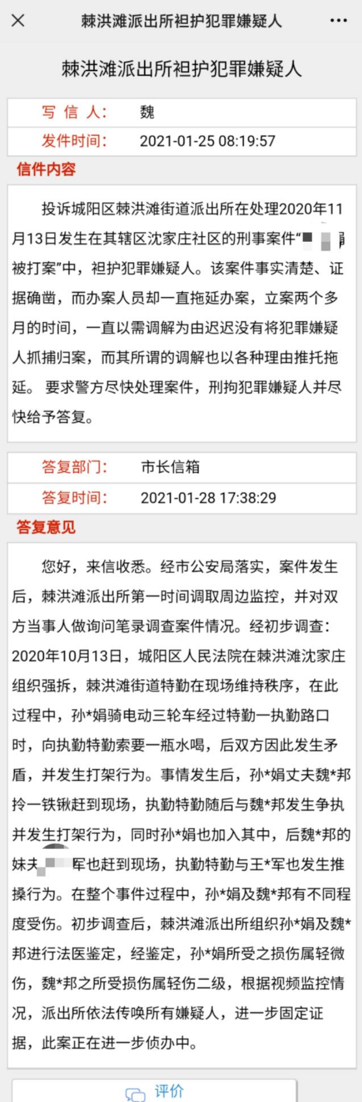城阳棘洪滩街道沈家庄社区的孙女士向市长信箱反映,2020年10月13日,她在路过沈家庄街道一处拆迁现场时遭到维持秩序的人员阻拦,此后她向执勤人员要水喝发生争执,和家人都遭到殴打。孙女士称,截止反映问题时,尚未收到赔偿和道歉。对此,市长信箱回应称,此案正在进一步侦办中。