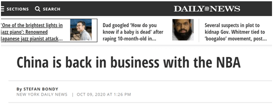 《福布斯》杂志称,在1年前中央广播电视总台暂停NBA赛事转播后,修补和中国的关系一直是NBA的优先事项。NBA总裁亚当·肖华曾形容与(中国关系)破裂带来的损失是“巨大的”,并称可能带来数亿美元损失。