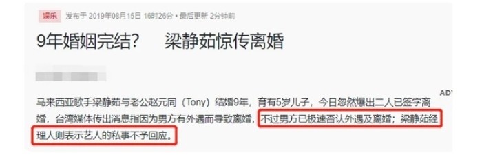 其实在梁静茹宣布离婚前,就有媒体爆料两人离婚消息,当时港媒还表示两人离婚是因为赵元同劈腿、背叛婚姻。
