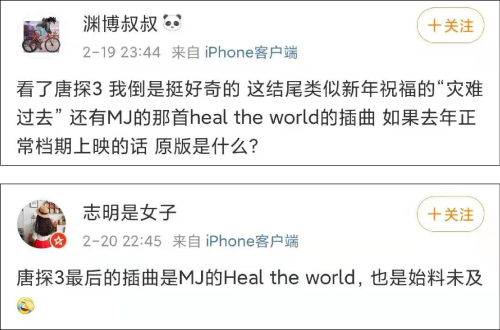 由于《唐人街探案3》在片尾曲使用了迈克尔·杰克逊的经典歌曲《Heal the World》,不少观众对此感到十分惊讶。
