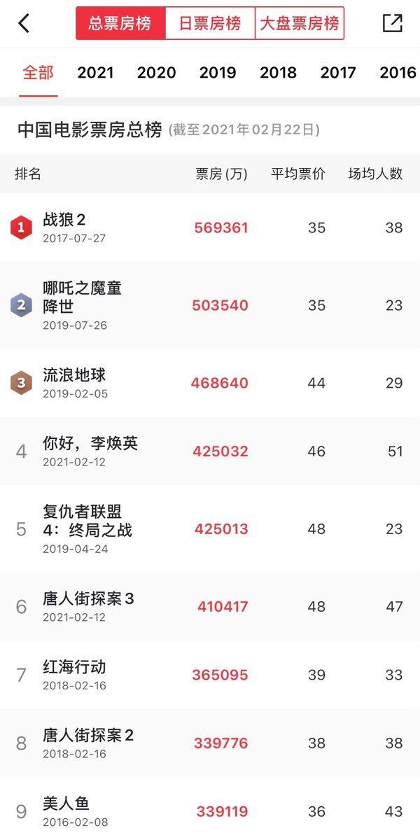 2月23日,根据猫眼专业版数据显示,《你好,李焕英》已成功超过《复仇者联盟4:终局之战》的票房,升至中国电影票房总榜第4名。