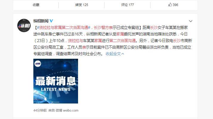 距离长沙女子车某某在搬家途中跳车身亡事件已过去16天,纵相新闻记者从受家属委托发声的湖南当地媒体处获悉,今日(23日)上午10点,货拉拉与车某某家属进行第二次当面沟通。另外,记者今日致电长沙市高新区公安分局政工室,工作人员表示目前案件已不由高新区公安分局麓谷派出所负责,当地已成立专案组调查,调查结果将及时向社会公布。