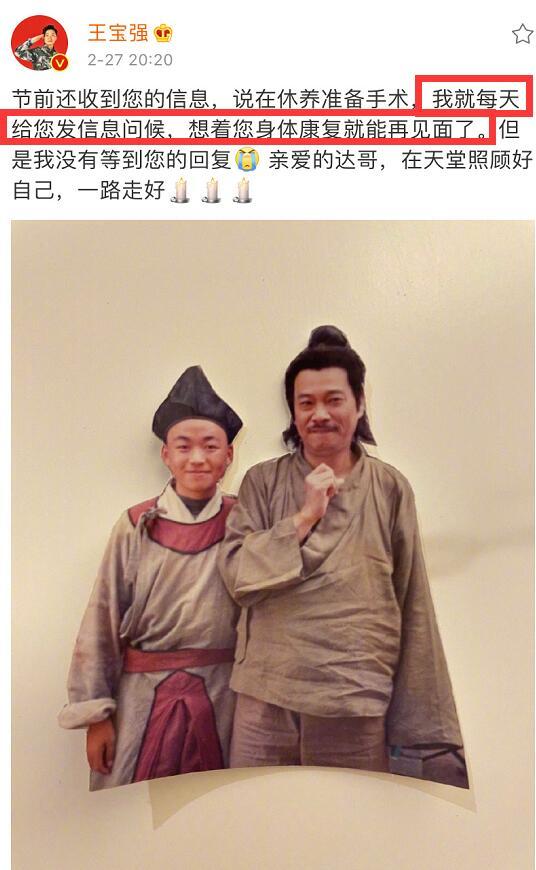 王宝强也发文进行悼念,他表示节前还收到过吴孟达的消息,后来每天都发问候给吴孟达。但是现在再也收不到吴孟达的回信了,看得出大家都非常悲痛吧。