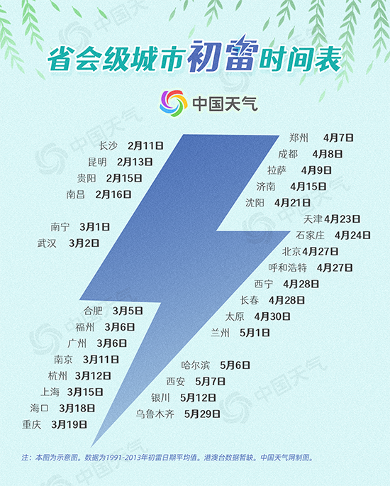 “微雨众卉新,一雷惊蛰始”。惊蛰期间,南方暖湿空气进一步增强,长江中下游、江南、华南北部以及云南南部的对流性天气明显增多,气象大数据显示,合肥、福州、广州、南京、杭州、上海、海口、重庆往往在惊蛰节气迎来初雷。