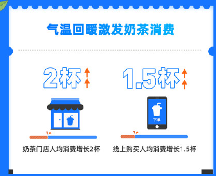 随着3月天气回暖,奶茶门店的人均消费增长了2杯,线上购买奶茶也多了1.5杯。