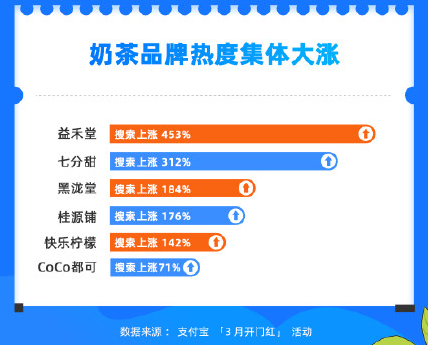 数据显示,3月上旬,支付宝上中老年人奶茶消费整体上涨10%。