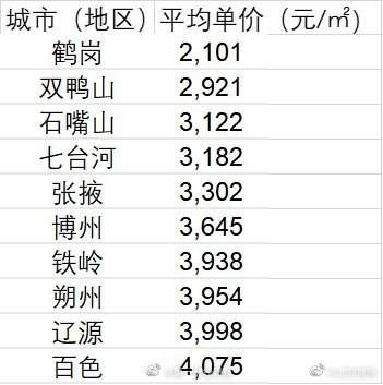 【#十大房价最低城市#:一半在东北 鹤岗最“白菜价”】当前,房价最低的10个地市(地区)分别是鹤岗、双鸭山、石嘴山、七台河、张掖、博州、铁岭、朔州、辽源、百色。其中,一半城市在东北地区。