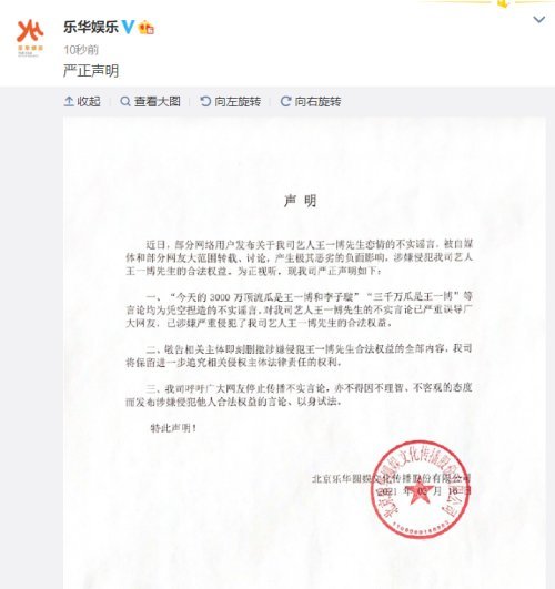 乐华娱乐发布声明否认两人恋情:“'今天的3000万顶流瓜是王一博和李子璇''三千万瓜是王一博'等言论均为凭空捏造的不实谣言。对我司艺人王一博先生的不实言论已严重误导广大网友,已涉嫌严重侵犯了我司艺人王一博先生的合法权益。敬告相关主体即刻删撤涉嫌侵犯王一博先生合法权益的全部内容,我司将保留进一步追究相关侵权主体法律责任的权利。
