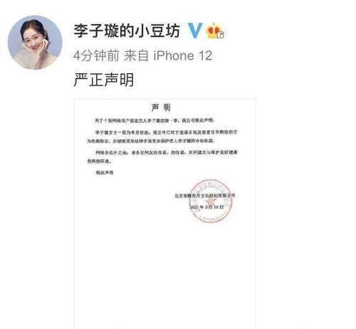 李子璇豆子工作室对于恋情传闻回应称:“李子璇女士一直是单身状态。我痛死已对于造谣言论及恶意引导舆论的行为收集取证,后续将采取法律手段坚决保护艺人李子璇的合法权益。”