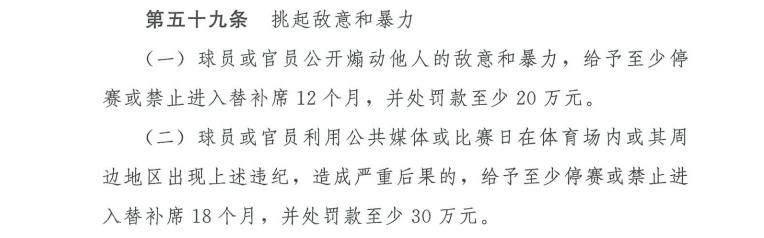 参与互动中新网客户端3月16日电 中国足协网站16日更新动态,发布了《中国足球协会纪律准则》,明确各类违纪行为的处罚标准。值得注意的是,准则规定球员或官员利用公共媒体或比赛日在体育场内或其周边地区出现“挑起敌意和暴力”行为,造成严重后果的,将至少给予停赛或禁止进入替补席18个月,并处罚款至少30万元。