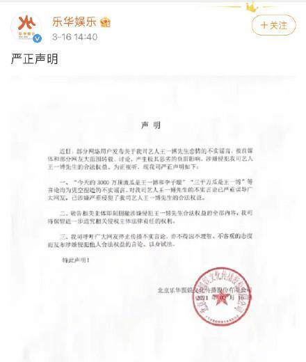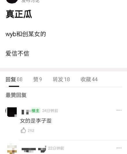 有网友爆料今天的3000万顶流瓜原本是王一博和李子璇。16日,乐华娱乐针对王一博与李子璇的恋情绯闻发布严正声明:“今天的3000万顶流瓜是王一博和李子璇”“三千万瓜是王一博”等言论均为凭空捏造的不实谣言。