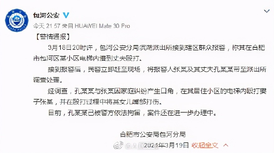 3月19日,合肥市公安局包河分局官方微博发布警情通报,3月18日20时许,包河公安分局滨湖派出所接到辖区群众报警,称其在合肥市包河区某小区电梯内遭到丈夫殴打。