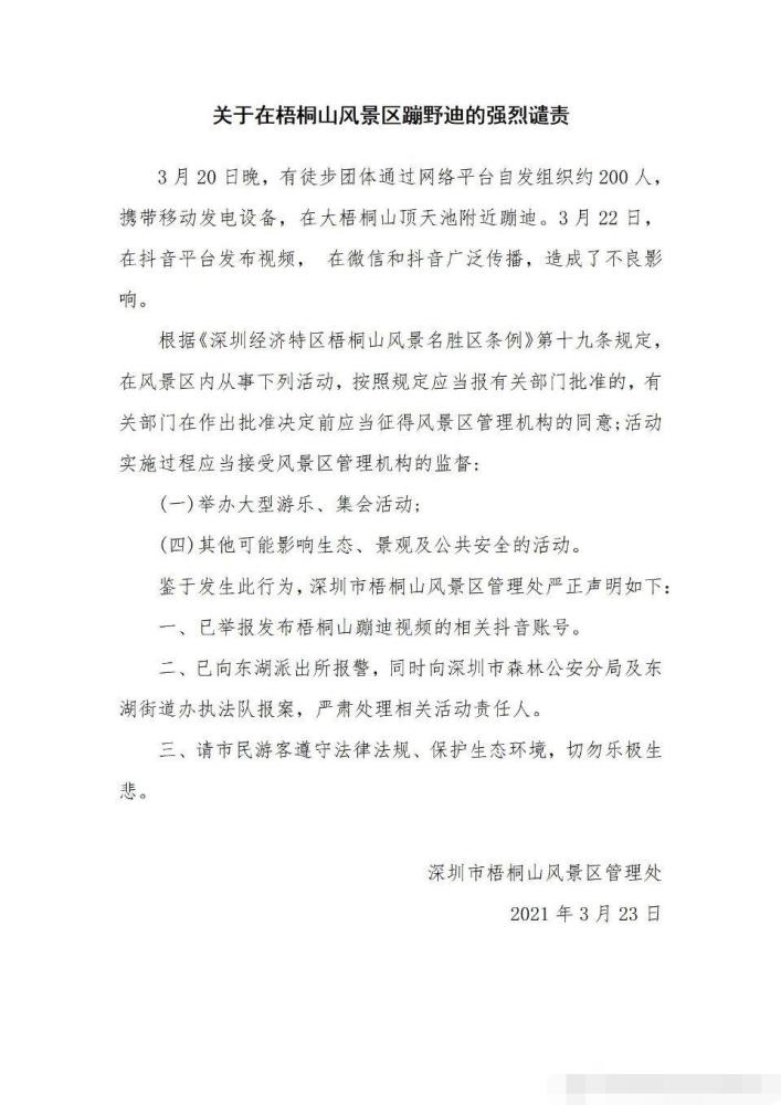 据深圳市梧桐山风景区管理处3月23日发布的消息,3月20日晚,有徒步团体通过网络平台自发组织约200人,携带移动发电设备,在大梧桐山顶天池附近蹦迪。3月22日,在抖音平台发布视频,在微信和抖音广泛传播,造成了不良影响。