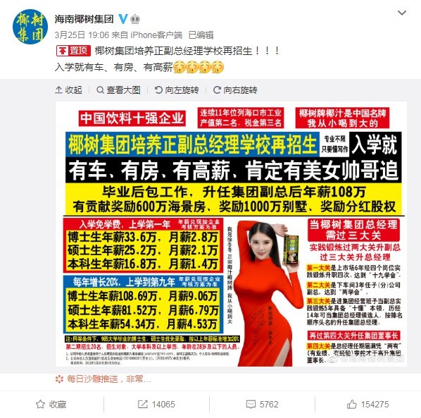 3月25日,海南椰树集团在其官方微博发布了一则招生广告。这则广告显示,该集团培养正副总经理学校再招生,“毕业后包工作,升任集团副总后年薪108万,有贡献就奖励600万海景房,奖励1000万的别墅,奖励分红股权。”(中新经纬APP)