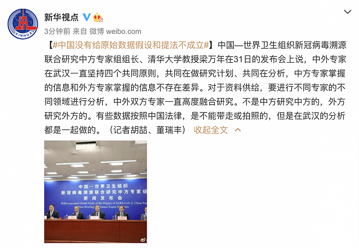 据@新华视点 微博消息,中国—世界卫生组织新冠病毒溯源联合研究中方专家组组长、清华大学教授梁万年在31日的发布会上说,中外专家在武汉一直坚持四个共同原则,共同在做研究计划、共同在分析,中方专家掌握的信息和外方专家掌握的信息不存在差异。对于资料供给,要进行不同专家的不同领域进行分析,中外双方专家一直高度融合研究。不是中方研究中方的,外方研究外方的。有些数据按照中国法律,是不能带走或拍照的,但是在武汉的分析都是一起做的。