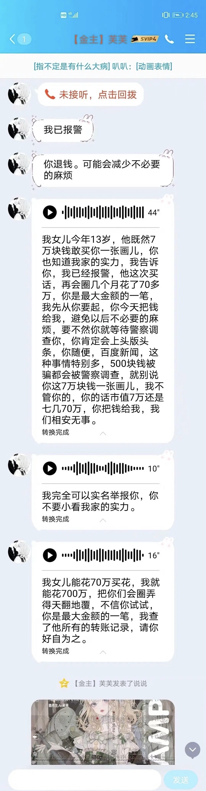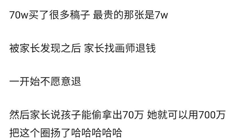 设圈一13岁女孩拿家里70w约稿,买了很多稿子,最贵的一张图是7w不能公开不能商用,
