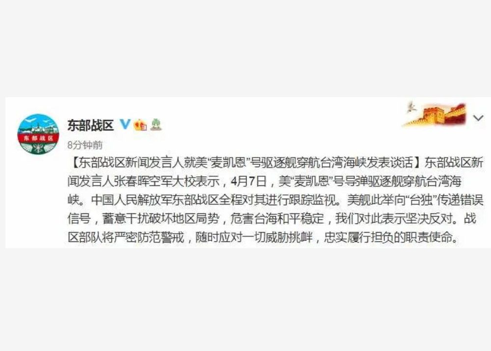 东部战区新闻发言人张春晖空军大校表示,4月7日,美“麦凯恩”号导弹驱逐舰穿航台湾海峡。