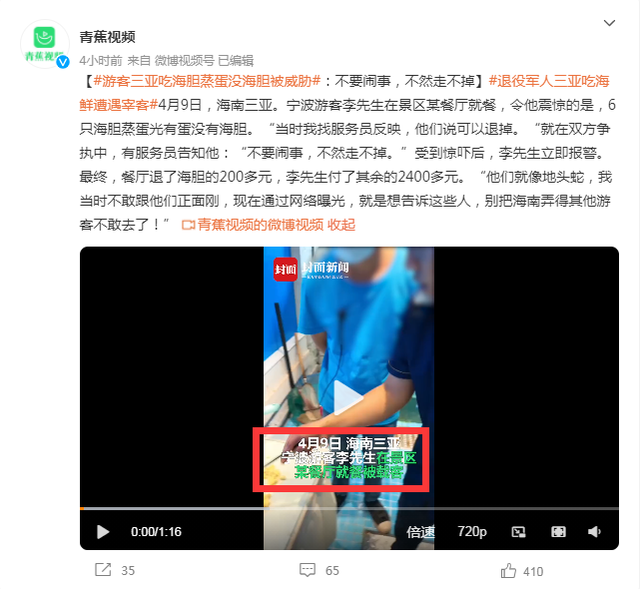 据封面新闻旗下青蕉视频报道,4月9日,宁波游客李先生在海南三亚景区某餐厅就餐,令他震惊的是,6只海胆蒸蛋光有蛋没有海胆。