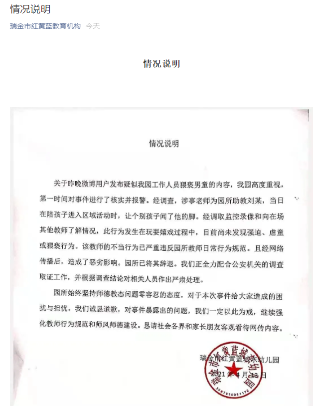 今日,瑞金市红黄蓝教育机构微信公众号发布情况说明称,关于昨晚微博用户发布疑似我园工作人员猥亵男童的内容,我园高度重视,第一时间对事件进行了核实并报警。