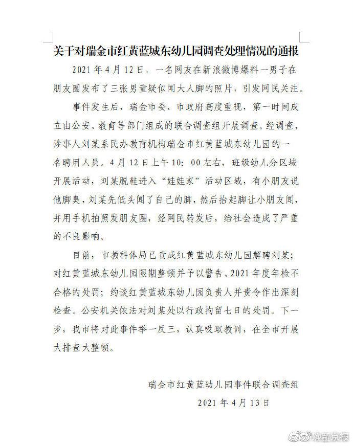 事件发生后,瑞金市委、市政府高度重视,第一时间成立由公安、教育等部门组成的联合调查组开展调查。经调查,涉事人刘某系民办教育机构瑞金市红黄蓝城东幼儿园的一名聘用人员。4月12日上午10:00左右,班级幼儿分区域开展活动,刘某脱鞋进入“娃娃家”活动区域,有小朋友说他脚臭,刘某先低头闻了自己的脚,然后抬起脚让小朋友闻,并用手机拍照发朋友圈,经网民转发后,给社会造成了严重的不良影响。
