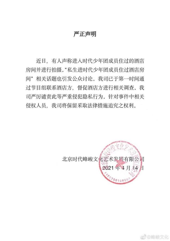 当天早些时候,时代少年团所在的时代峰峻文化已在微博发表声明,称有私生饭进入并拍摄时代少年团成员住过的酒店房间,称“已于第一时间通过节目组联系酒店方,督促酒店方进行相关调查,我司严厉谴责此等严重侵犯隐私行为;针对事件中相关侵权人员,我司将保留采取法律措施追究之权利”。