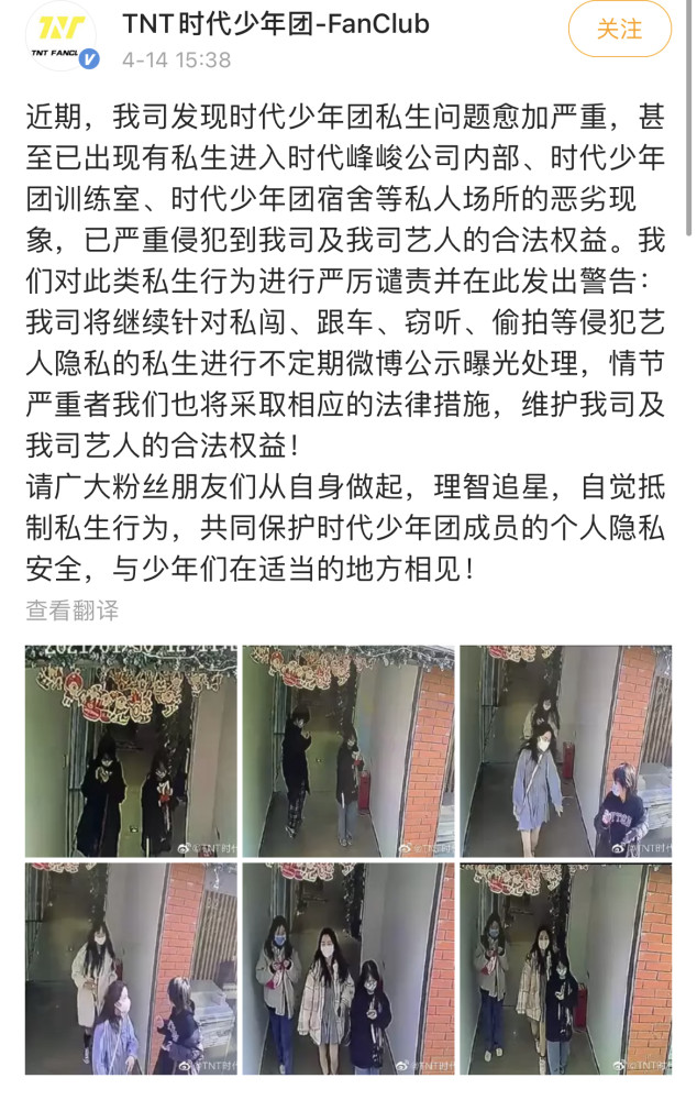 时代少年团粉丝俱乐部4月14日在其官方微博公开曝光了一组私生饭照片,并表示将继续针对私闯、跟车、窃听、偷拍等侵犯艺人隐私的私生饭进行不定期微博公示曝光处理,对情节严重者还将采取相应的法律措施。