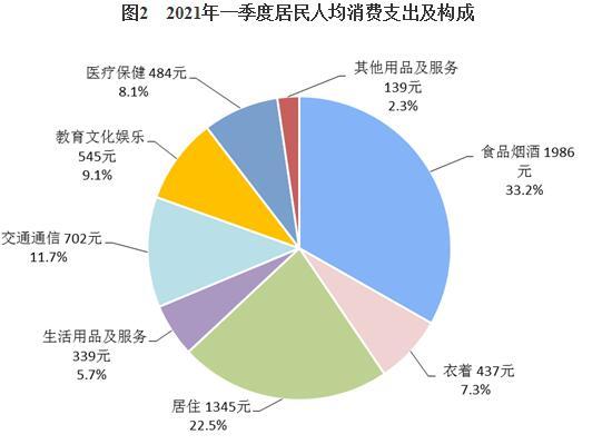 一季度,全国居民人均食品烟酒消费支出1986元,增长16.3%,占人均消费支出的比重为33.2%;人均衣着消费支出437元,增长18.4%,占人均消费支出的比重为7.3%;人均居住消费支出1345元,增长8.7%,占人均消费支出的比重为22.5%;人均生活用品及服务消费支出339元,增长19.9%,占人均消费支出的比重为5.7%;人均交通通信消费支出702元,增长16.0%,占人均消费支出的比重为11.7%;人均教育文化娱乐消费支出545元,增长55.7%,占人均消费支出的比重为9.1%;人均医疗保健消费支出484元,增长16.1%,占人均消费支出的比重为8.1%;人均其他用品及服务消费支出139元,增长24.2%,占人均消费支出的比重为2.3%。