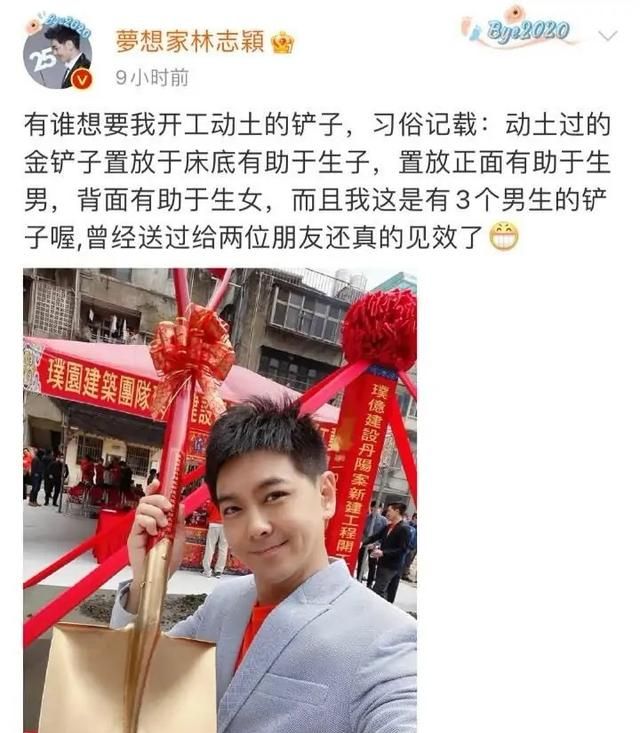 在配文中,林志颖询问“有谁想要我开工动土的铲子”,而询问的原因竟是所谓的“动土过的金铲子置放于床底有助于生子”的习俗,而且他还在最后强调“我这是有3个男生的铲子喔”。