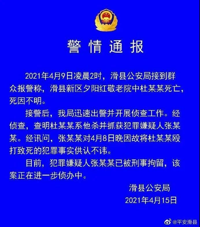 【#养老院86岁老人打死79岁室友# 家属称自救铃成摆设】4月15日,河南省滑县公安局发布通报称,4月8日晚,滑县新区夕阳红敬老院内,张某某因故将杜某某殴打致死。目前,犯罪嫌疑人张某某已被刑事拘留,该案正在进一步侦办中。