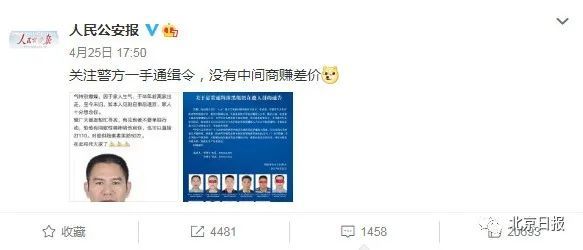 对此,@人民公安报 打趣道:“关注警方一手通缉令,没有中间商赚差价。”