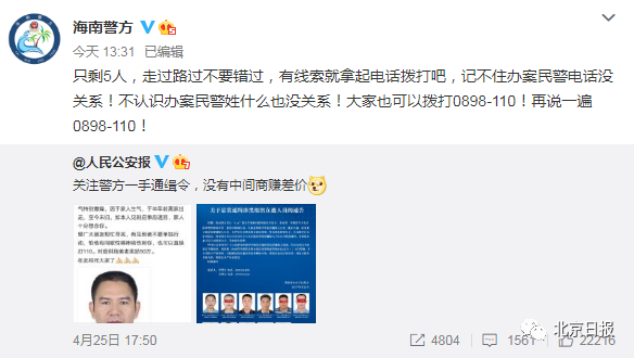 实际上,留给大家抓坏蛋的机会不多了。@海南警方 转发提示道,通缉令发布仅三天,11名在逃嫌疑人已有6人投案。“只剩5人,走过路过不要错过,有线索就拿起电话拨打吧,记不住办案民警电话没关系!大家也可以拨打0898-110!再说一遍0898-110!”