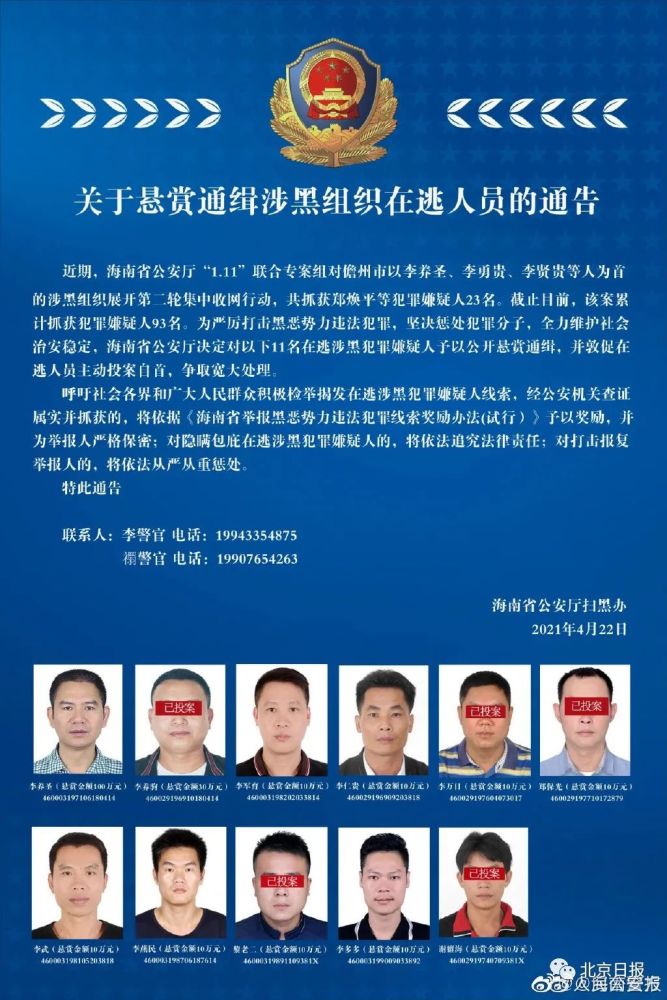 4月23日,海南省公安厅扫黑办发布《关于悬赏通缉涉黑组织在逃人员的通告》,对11名在逃涉黑犯罪嫌疑人予以公开悬赏通缉,并敦促在逃人员主动投案自首,争取宽大处理。
