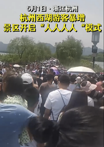 5月1日,大量游客涌入杭州西湖景区,景区开启“人人人人”模式,来自全国各地的游客们挤在一起向前移动,断桥变身“人桥”。