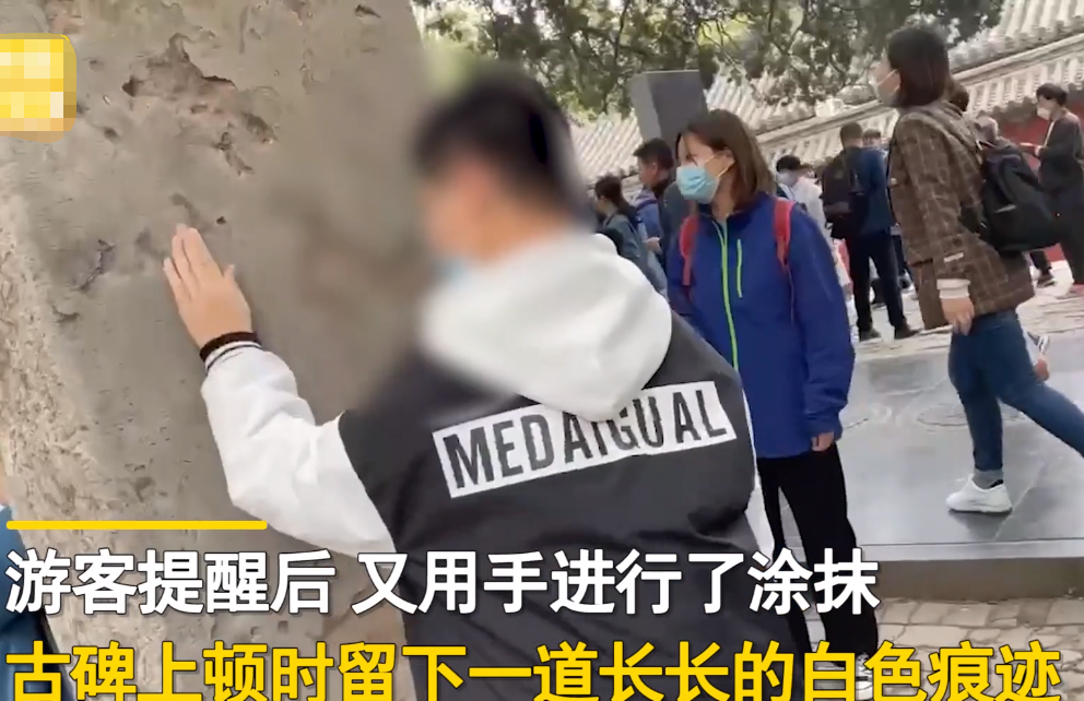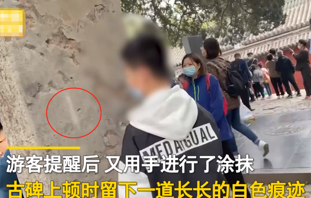 令人气愤的是,熊孩子不仅对游客的劝阻丝毫不理会,而且还故意用手在古碑上涂抹,以至于古碑上留下了一道长长的白色痕迹。在此期间,熊孩子的家长并未出现。游客呼吁:希望大家出行的时候要文明出游,爱护好身边的一些文物古迹和自然风光。