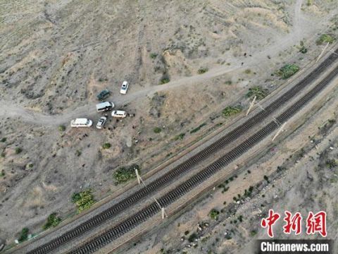 图为航拍兰新铁路列车撞人事故现场。 杨艳敏 摄